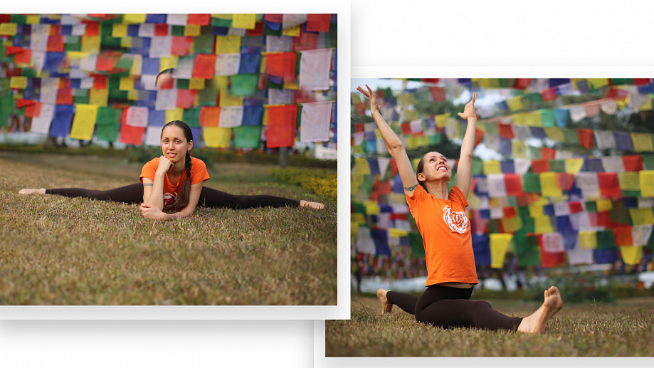 Несколько блоков асан (силовые/гибкостные) продольного направления с двумя подходами к хануманасане (продольный шпагат), с вариантами облегчения/углубления, а также фиксация в доступном для вас на текущий момент варианте асаны;